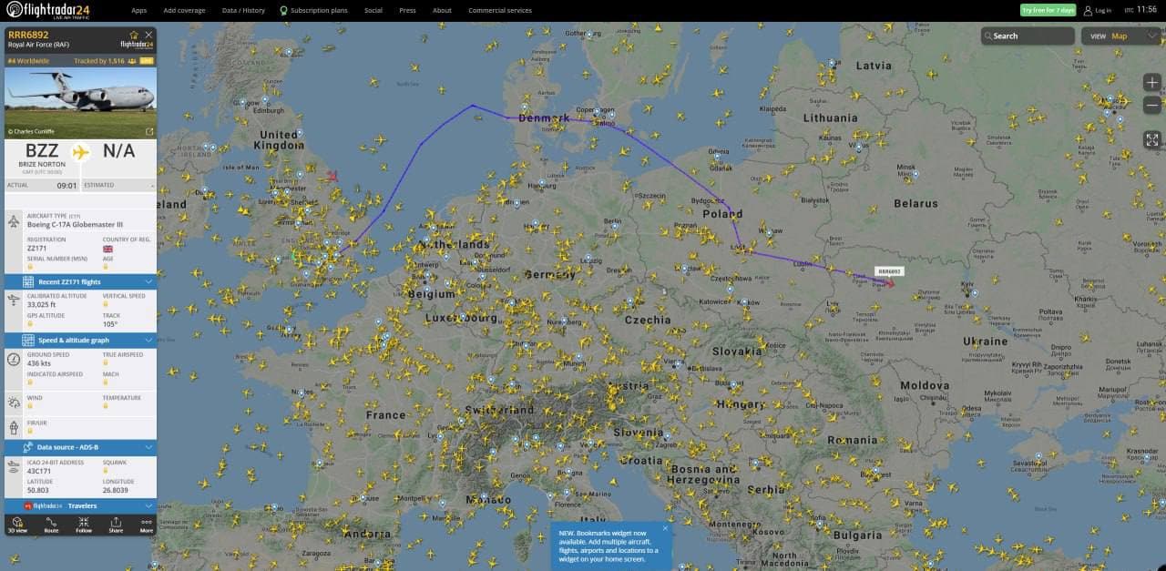 Депутат Рады Алексей Гончаренко заявил в Telegram, что выбранный самолетами ВВС Великобритании маршрут для поставок вооружения на Украину якобы связан с российским газопроводом "Северный поток — 2".