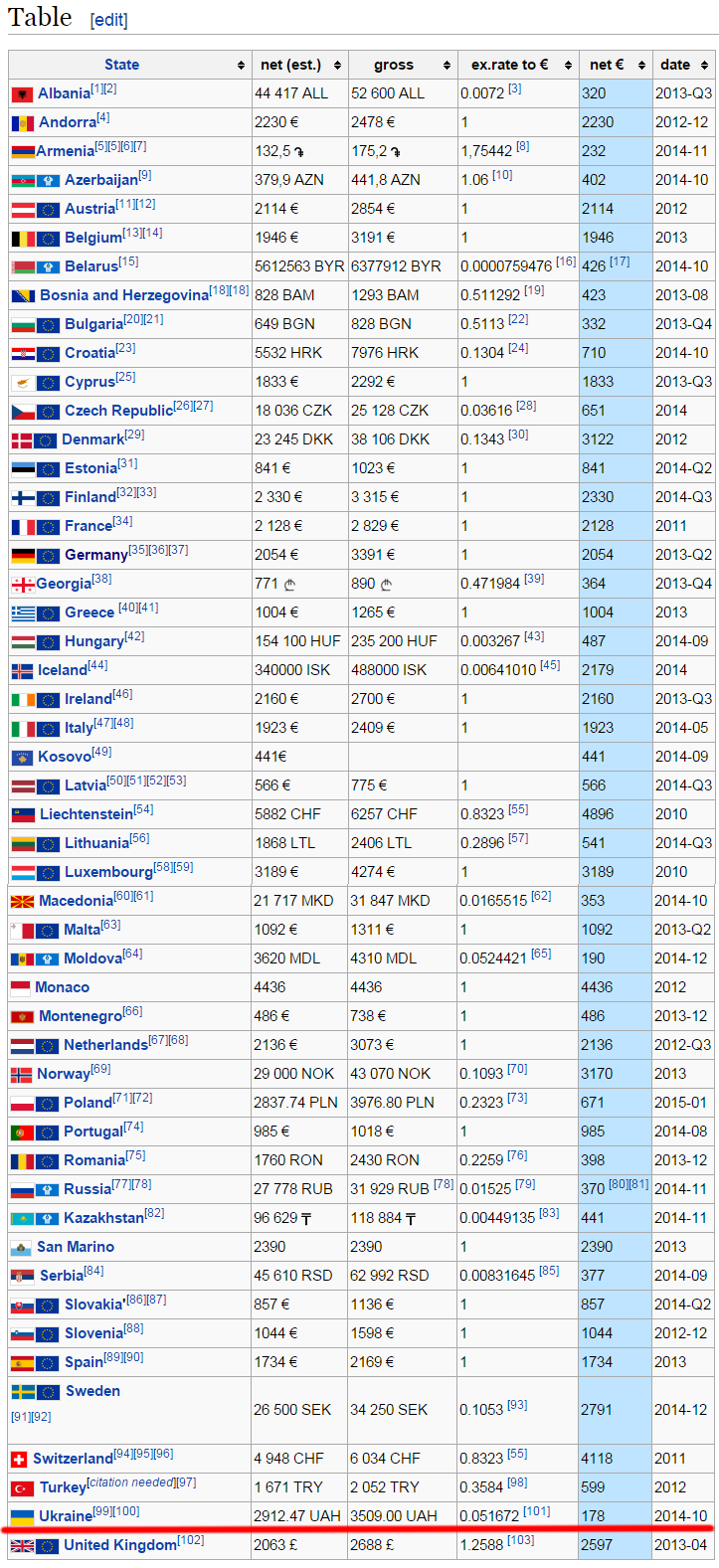 Среднемесячная зарплата украинцев в 2014 году оказалась самой низкой среди жителей Европы, свидетельствуют данные инфографики, опубликованной на странице англоязычной версии Википедии.