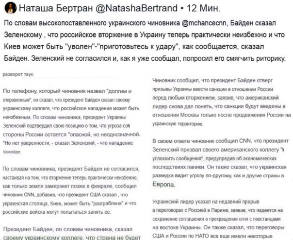 Джо Байден сказал своему украинскому коллеге Владимиру Зеленскому, что российское вторжение будет "теперь совершенно определенно". российское вторжение будет "скорым," что столица Киев может быть "разграблена", и стоит "готовиться к удару."