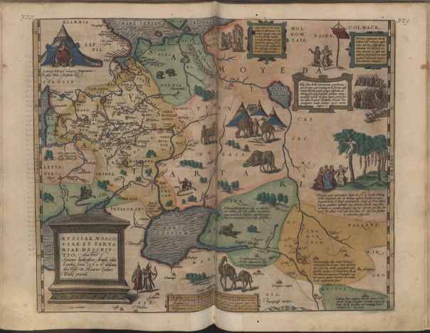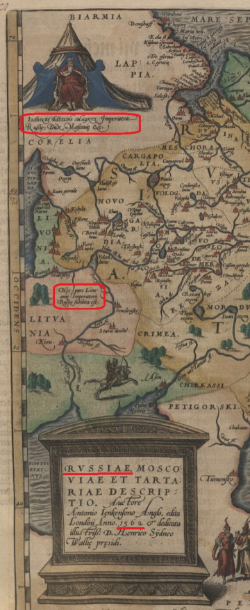 ОБРАТИМ ВНИМАНИЕ — в верхнем левом углу карты обозначен русский царь на троне, и на латыне описание: Иван Васильевич Великий, Император Русский / Руси; князь Московский.