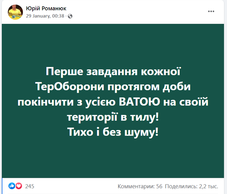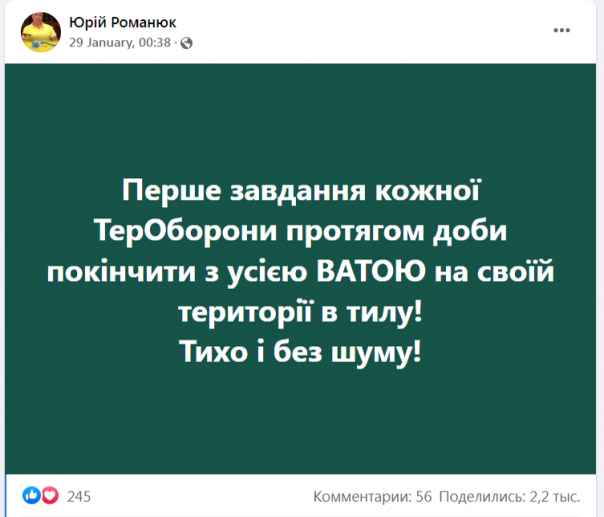 «Первое задание каждой терробороны в течение суток покончить со всей ВАТОЙ на своей территории в тылу! Тихо и без шума!», - заявил Романюк.