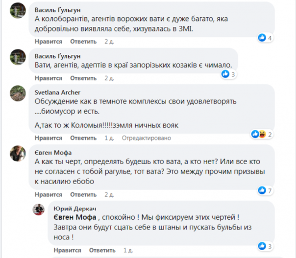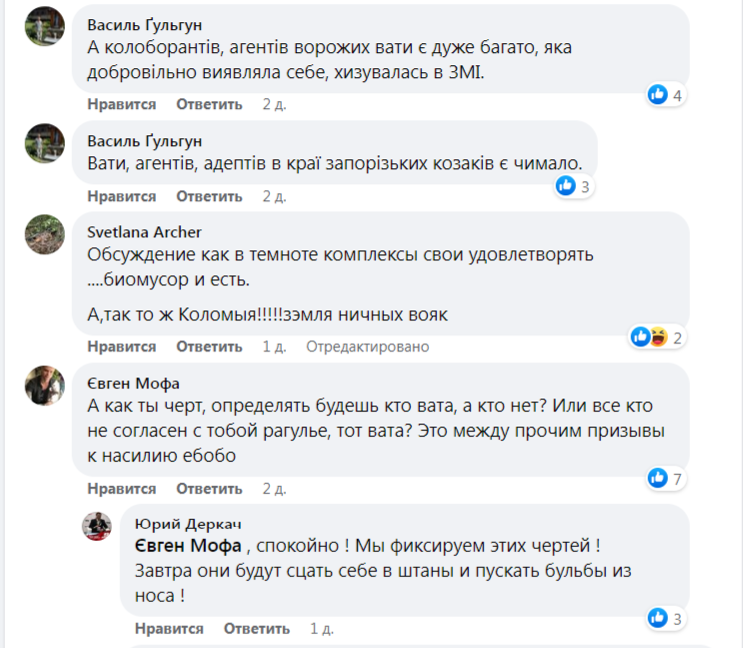 «Обсуждение как в темноте комплексы свои удовлетворять ....биомусор и есть. А, так то ж Коломыя!!!!! Зэмля ничных вояк», - иронично заметила Svetlana Archer.