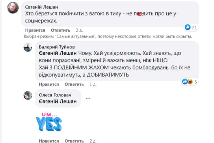 Некоторые при этом, как, к примеру, украинский журналист, печатавшийся на «Обозревателе», Евгений Лешан, одернул автора, сообщив, что «кто берется покончить с ватой в тылу – не п**дит об этом в соцсетях».