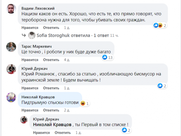 «Спокойно! Мы фиксируем этих чертей! Завтра они будут сцать себе в штаны и пускать бульбы из носа! Юрий Романюк, спасибо за статью, изобличающую биомусор на украинской земле! Будем вычищать!», - написал Юрий Деркач.