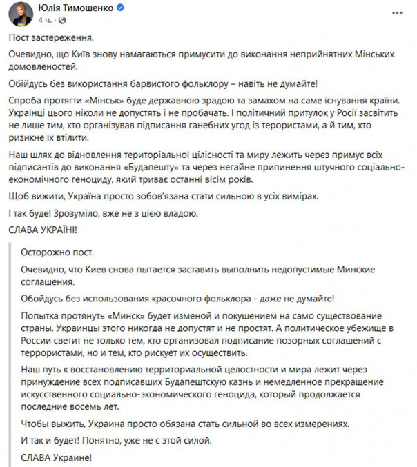Лидер «Батькивщины» Юлия Тимошенко назвала выполнение минских соглашений государственной изменой, и призвала президента Владимира Зеленского требовать выполнения Будапештского меморандума, который защитит территориальную целостность Украины. Свой пост нардеп обнародовала в соцсетях.
