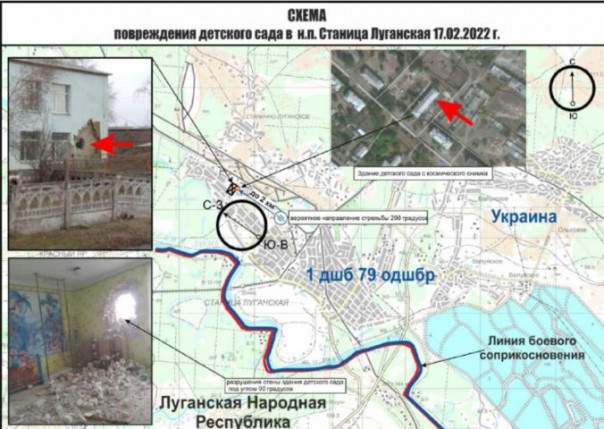 В ЛНР заявили, что обстрел детского сада в Станице Луганской велся под таким углом, что стрелять могли только с восточного направления - позиция предполагаемого орудия, из которого велся огонь, находится на территории контролируемой 79-й бригадой украинской армии.