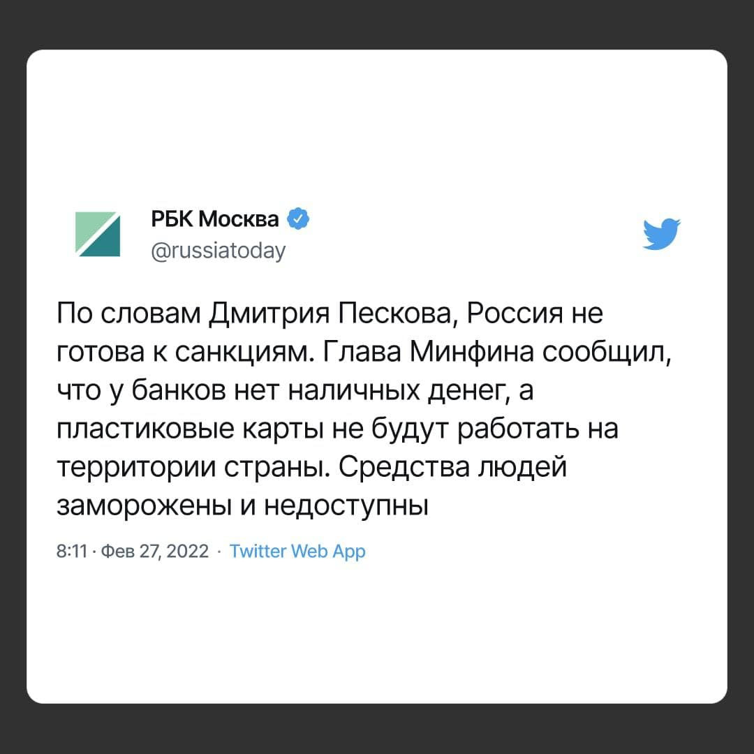 отдельно стоит сказать о попытках посеять панику среди россиян по поповоду блокирования банковских счетов, отсутствия денег на выплату зарплат и отключения России от системы SWIFT.