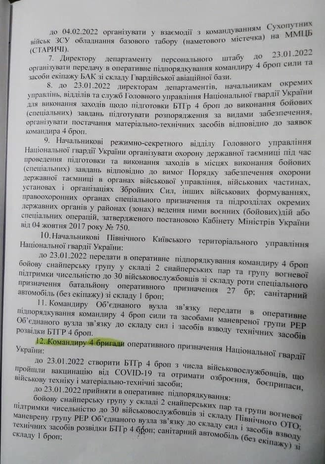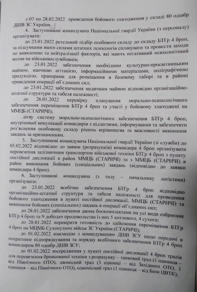 В соответствии с приказом, заместителю командующего нацгвардии была поставлена задача с 7-го по 28-е февраля 2022 организовать боевое слаживание батальонно-тактической группы нацгвардии в составе 80-й отдельной десантно-штурмовой бригады вооруженных сил Украины.