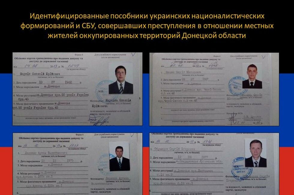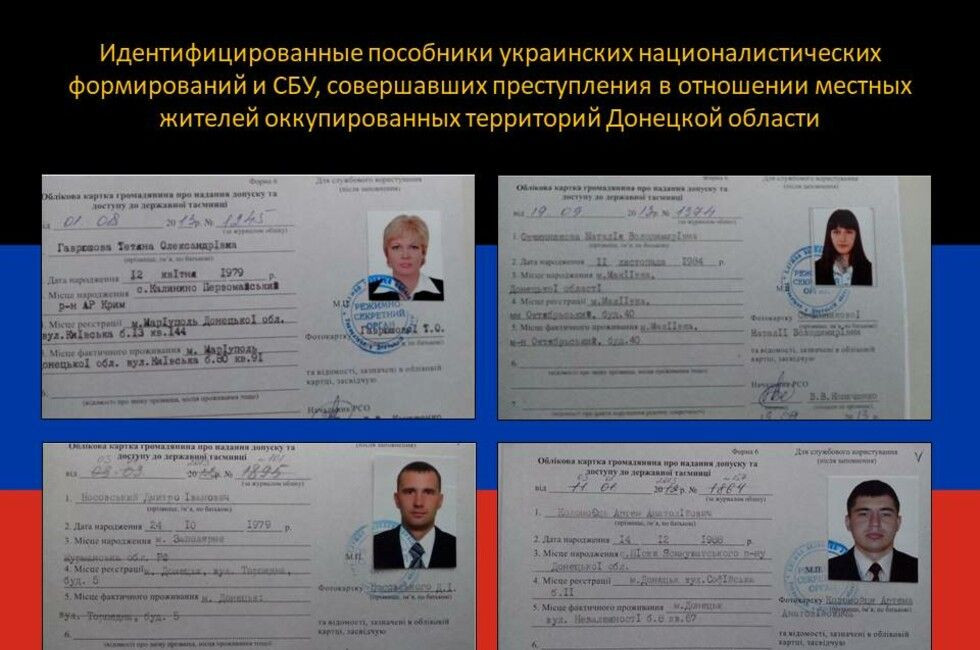 «В нашем распоряжении оказались электронные носители информации и различные документальные подтверждения, обнаруженные при обследовании освобожденных населенных пунктов Волноваха, Старогнатовка и Новотроицкое, со списками сотрудников СБУ и сотрудничавших с ними местных жителей, осуществлявших доносы на своих знакомых и соседей, не разделяющих героизацию нацистских преступников и репрессивную украинизацию, а также передававших информацию о военных объектах, военнослужащих и жителях ДНР», – сказал Басурин.
