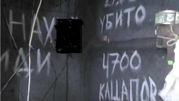 «4700 кацапов убито» — гласит ещё одна надпись на стене. Кто-то очень гордился этим, но, глядя на произошедшее накануне, становится понятно, что в этот список не вкладывались военные заслуги украинских боевиков, речь не идёт о боях с армией ДНР, это не честный бой на равных. Чей-то воспалённый рассудок с особым зверством вёл счёт убитых женщин, стариков и детей. Убитый снайпером пенсионер в Коминтерново, трое детей, получивших тяжелейшие ранения в Саханке, обстрел единственного курортного посёлка в ЛДНР – всё это и есть те самые «успехи», которыми гордился автор надписи.