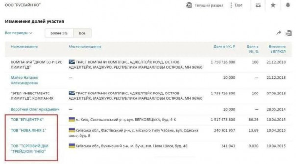 Недвижимостью в России почти на два миллиарда рублей владеет и известный украинский олигарх Александр Герега – основатель сети магазинов «Эпицентр». При этом, по имеющимся данным, структуры Гереги активно продолжают скупать российскую «недвижку». Так, ООО «Руслайн КО» из подмосковного Пушкино, согласно учредительным документам, основано компанией ПАТ «Оферент», принадлежащей Александру Гереге. «Руслайн КО» в 2015 году перешла под полный контроль его оффшорной компании «Дром Венчерс Лимитед».