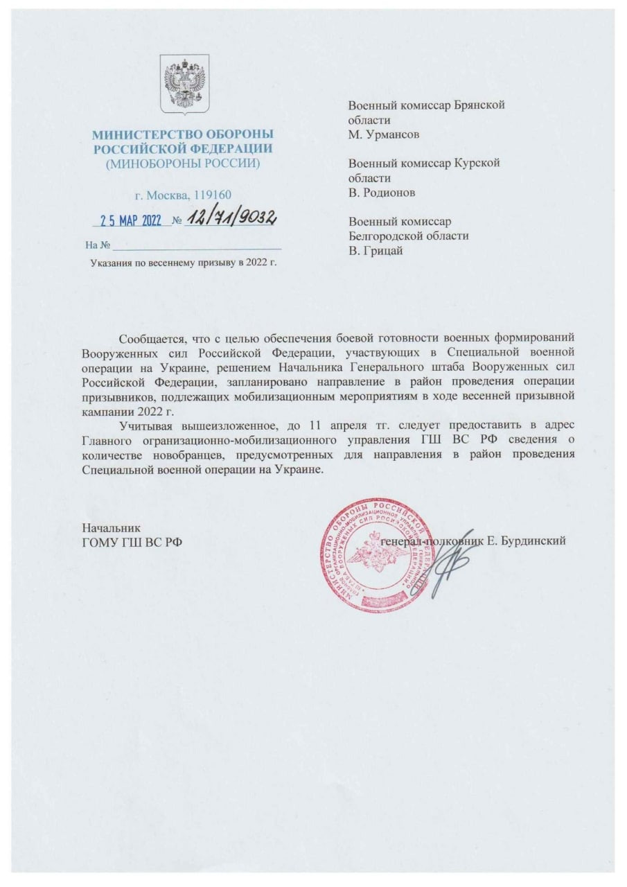 «Сообщается, что с целью обеспечения боевой готовности военных формирований ВС РФ, участвующих в Специальной военной операции на Украине, решением Начальника Генерального штаба ВС РФ, запланировано направление в район проведения операции призывников, подлежащих мобилизационным мероприятиям в ходе весенней призывной кампании 2022 г.».