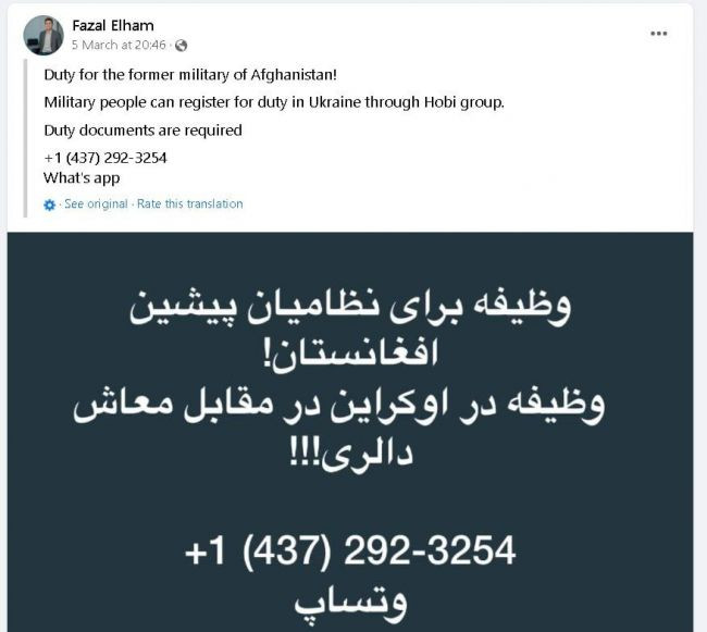 В доказательство авторитетный телеграм-канал приводит скриншот со страницы некоего Фазала Эльхма, который приглашает на работу афганских военных (служивших при президенте Ашрафе Гани) на Украине, причем для связи по WhatsApp указан номер телефона в Торонто (Канада).