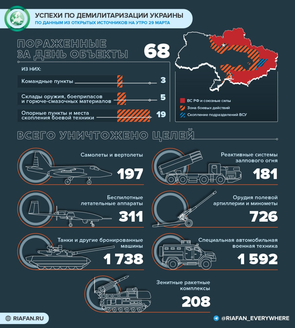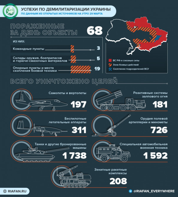 Спецпредставитель Минобороны РФ Игорь Конашенков рассказал про достижения российской армии на Украине с 28 на 29 марта.
