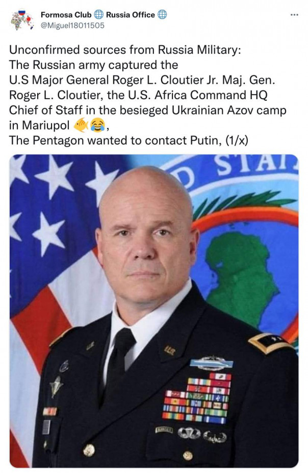В настоящее время циркулируют многочисленные сообщения, утверждающие, что генерал-майор армии США Роджер Л. Клутье был захвачен российскими войсками в Мариуполе или около него, Украина, где, как утверждают отчёты, он помогал батальону АЗОВ, который является официальным нацистским подразделением Украины.