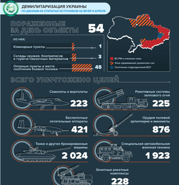 Специальная военная операция армии РФ на Украине длится уже 44 дня. По последним новостям, 8 апреля, войска РФ добились важных целей: уничтожили базу наёмников и ликвидировали несколько крупных боевых машин и систем ВСУ.