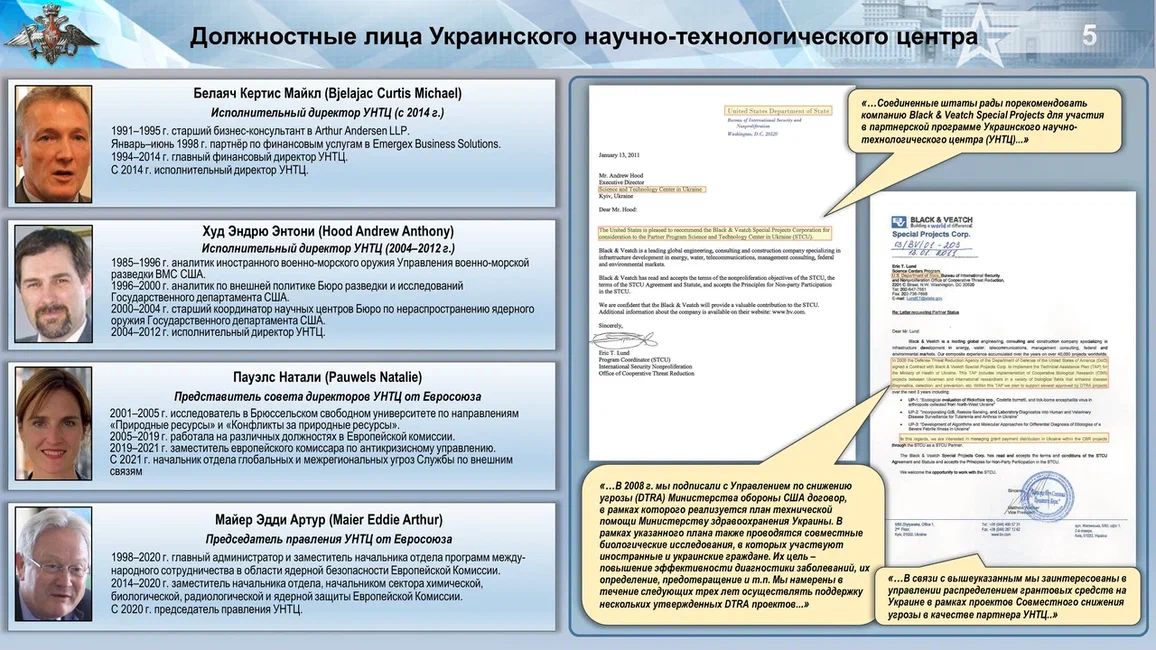 Российские военные опубликовали список имён американских и европейских сотрудников Украинского научно-технологического центра (УНТЦ), который занимался исследованиями в интересах военно-биологической программы США. По данным Минобороны РФ, использованные американской стороной формулировки указывают на факт работы украинских экспертов над созданием средств доставки и применения оружия массового поражения.