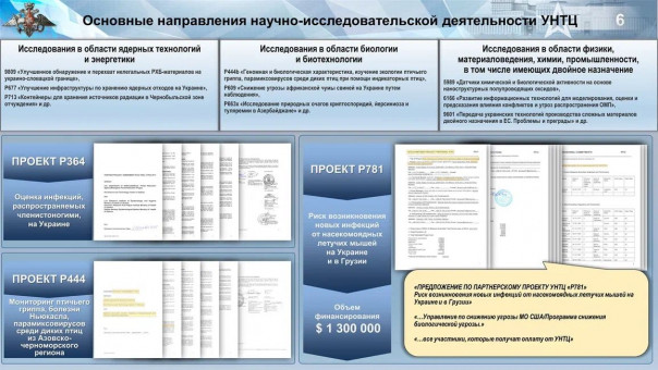 Вместе с тем, Экспертный центр химических и биологических угроз Министерства обороны России установил, что основной вид деятельности УНТЦ – это выполнение функций распределительного центра грантов для проведения интересующих Пентагон исследований, в том числе – в области биологического оружия.