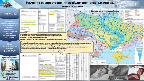 В ходе работ украинскими специалистами под контролем американских ученых систематически проводился отбор проб воды в ряде крупных рек Украины, включая Днепр, Дунай, Днестр, а также в Северо-Крымском канале с целью установить наличие особо опасных патогенов, включая возбудителей холеры, брюшного тифа, гепатитов А и Е, и сделать выводы о возможности их распространения водным путем.