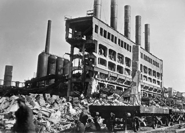 Разрушенная фашистами воздуходувная станция завода "Азовсталь", хроника Великой Отечественной, 1943 год