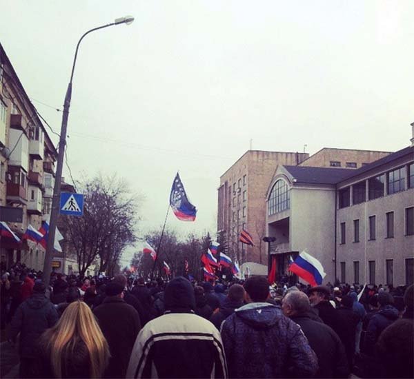 Как сообщили наши источники в Донецке, митингующие люди, многие из которых представляются как «Народная самооборона Донбасса», выдвинулись к офисе назначенного киевской хунтой губернатором Донецкой области олигарха Таруты.На здании офиса олигарха был установлен российский флаг.