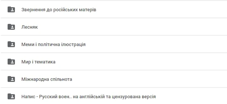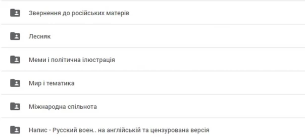 Картинки разложены по тематическим папкам: украинский флаг, «антипропаганда для россиян», отдельно про русский корабль и даже про "бандеровский смузи" (так называют коктейль Молотова). В общем, вся агитация на просторах интернета берется не на пустом месте. Некоторые плакаты переведены на польский и английский языки.