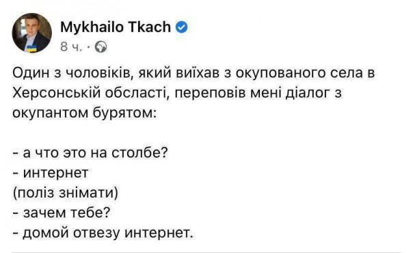 Друзья, российские оккупанты увозят с Украины к себе домой не только нутеллу, асфальт и унитазы, но и интернет. Прямо со столбов его снимают.