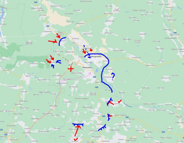 3. Развивается наступление к северу от Попасной в направлении Камышевахи (создавая угрозу охвата укрепрайона в Золотом и Горском) + прощупывают оборону ВСУ в направлении Артемовска.