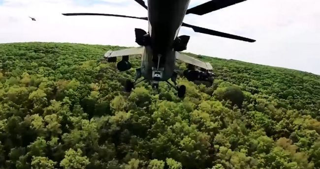 На кадрах можно видеть, как в процессе полета Ми-35 наводит неуправляемые ракеты по заданному квадрату и наносит удар по объектам противника. При этом винтокрылая машина снижает высоту и, заходя на вираж, залетает в овраг, где противник не сможет достать ее из ПЗРК «Стингер» или «Игла».
