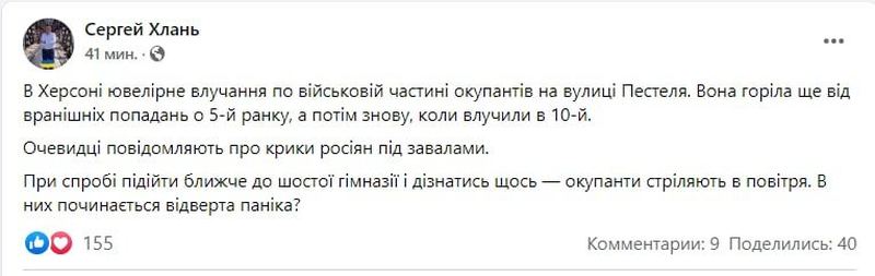 Украинская сторона утверждает, что ВСУ нанесли удар по воинской части РФ на улице Пестеля.