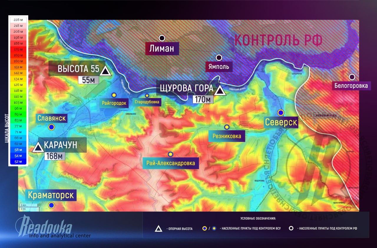 Следующей важной точкой является безымянная высота (55м) в Райгородке. Это отвал меловой породы, который используется для удержания прохода на Славянск из Лимана. Оба города находятся в низине, с этой же позиции ВФУ удерживают под огневым контролем Северский Донец в районе Стародубовки.