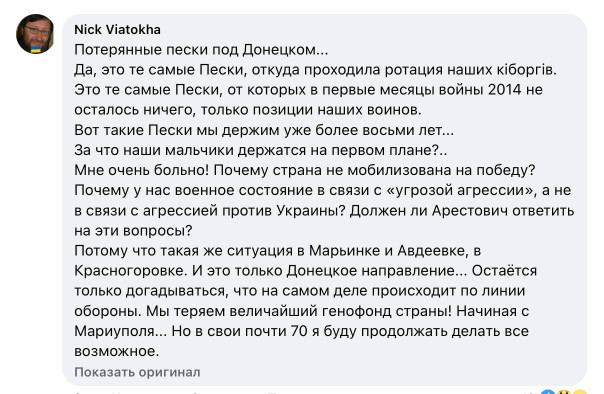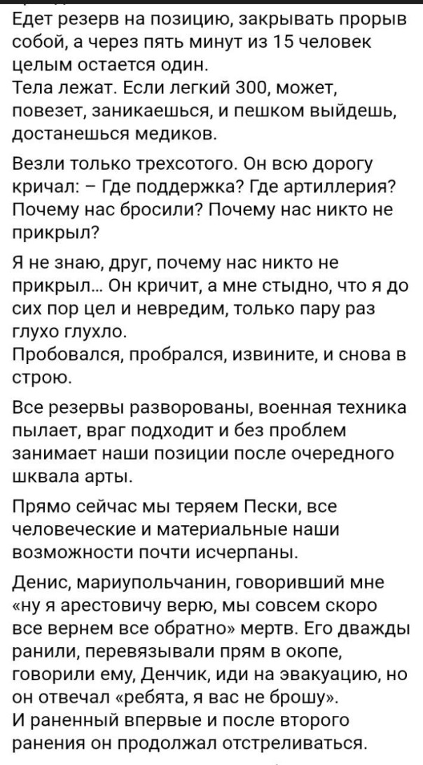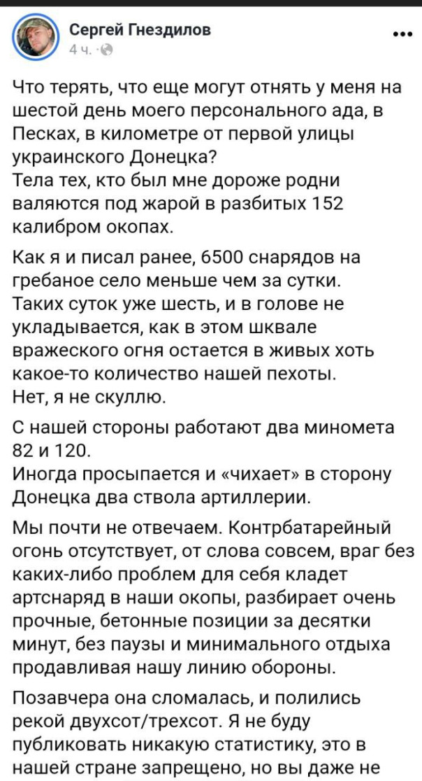 "Мы еще не можем сломать преимущество российской армии в артиллерии и в живой силе, и это очень чувствуется в боях, особенно на Донбассе – Пески, Авдеевка, другие направления. Там просто ад. Этого даже не описать словами..."