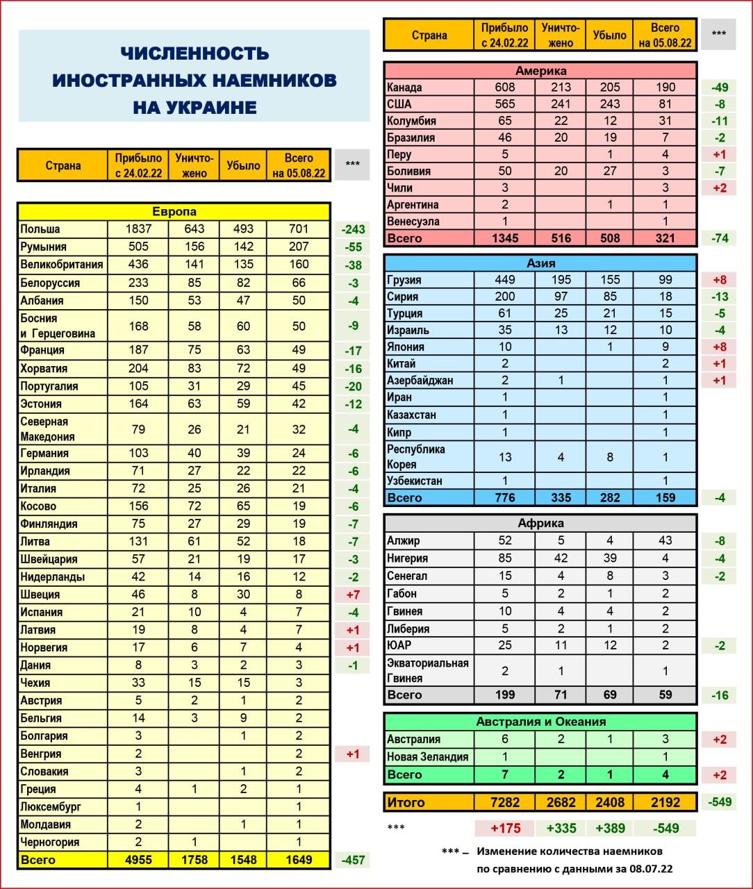 ● За почти четыре недели – с 8 июля по 5 августа, – в результате наступательных действий российских Вооруженных Сил и подразделений народных милиций Донецкой и Луганской народных республик, число наёмников на Украине уменьшилось с двух тысяч семисот сорока одного до двух тысяч ста девяноста двух человек.