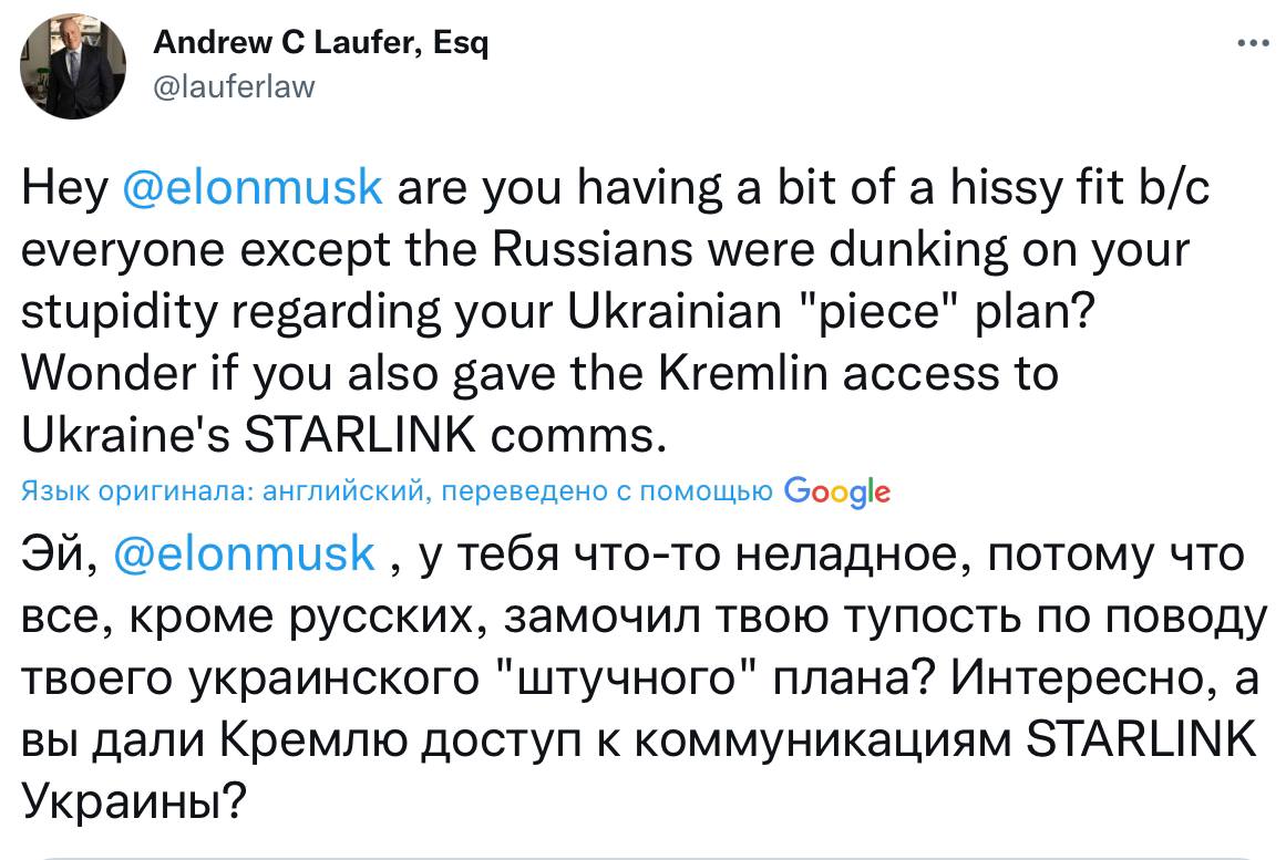 План Маска для урегулирования конфликта на Украине выглядит так: сохранение Крыма российским, как это было с 1783 года, до того, как Никита Хрущев допустил ошибку 1953 года, гарантии водоснабжения для Крымского полуострова, нейтральный статус Украины. Кроме того, Маск предложил провести в Донбассе повторное голосовании о принадлежности региона под контролем ООН, на котором люди сами могут выбрать свой путь – с Киевым они или с Москвой. Также Илон Маск призвал Москву и Киев к миру. В своем "безумно исцеляющем" Twitter он написал, что сомневается в возможности победы Украины в полномасштабной войне с Россией, экономические и людские ресурсы которой в разы превышают украинские.