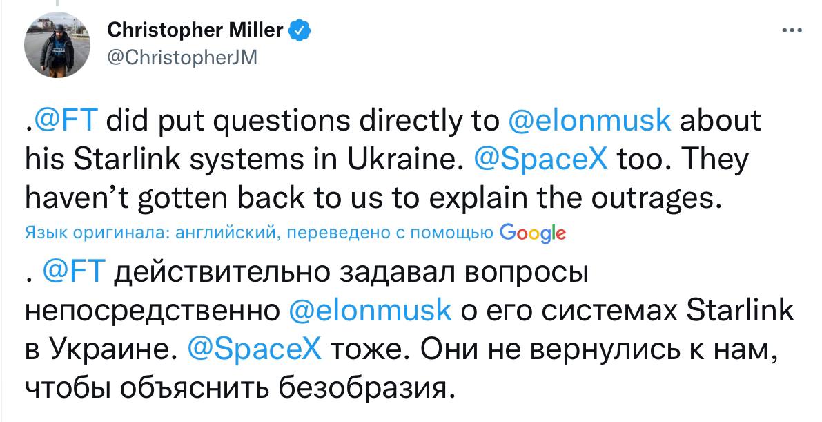 Маск и SpaceX не ответили на запросы о комментариях. Министр обороны Украины Алексей Резников от комментариев отказался. Пресс-секретарь главнокомандующего Вооруженными силами Украины генерала Валерия Залужного от комментариев отказался.