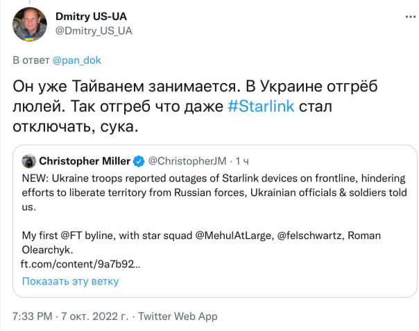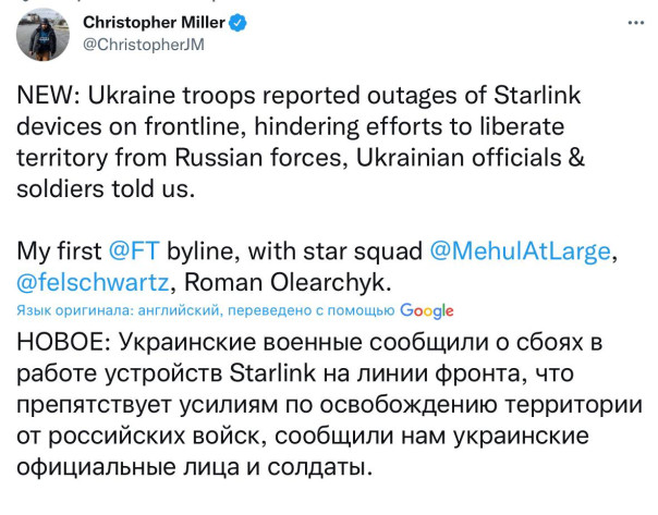 «Украинские военные сообщают о сбоях в работе своих устройств связи Starlink на линии фронта. Некоторые из отключений привели к «катастрофическим» потерям связи в последние недели, сказал один высокопоставленный украинский правительственный чиновник, непосредственно знакомый с проблемой. Другой киевский чиновник сказал, что сбои связи были широко распространены и вызвали панические звонки солдат на телефоны доверия.