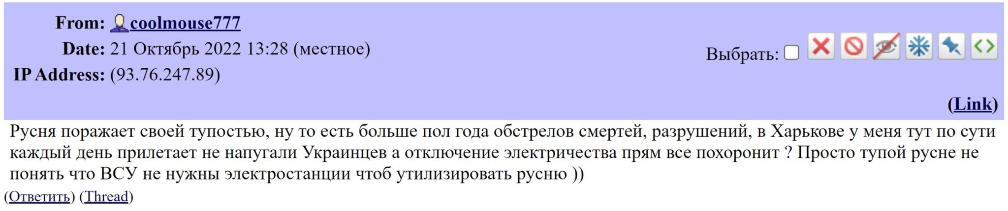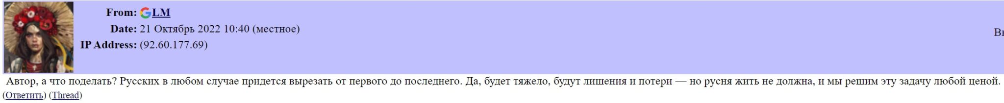 Что, неприятно? А я просто слегка отзеркалил (без жести и призывов убивать всех, включая беременных и детей, как это регулярно пишут укронацисты).