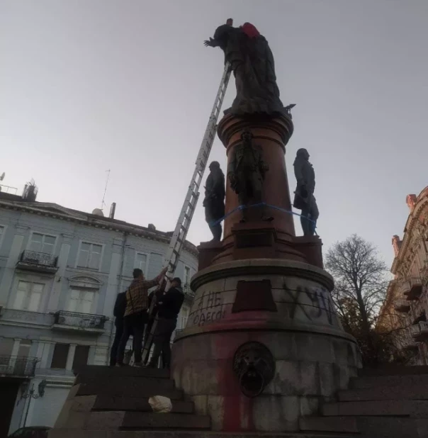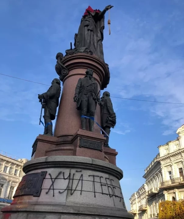 «Маркерам русского мира не место в украинском городе. Мы считаем, что такой вид [с мешком на голове и удавкой] значительно лучше. Екатерина уничтожила остатки украинской государственности, уничтожила Запорожскую Сечь, закрепостила крестьян и проводила политику государственного антисемитизма.