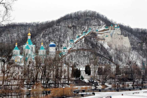 К сожалению, всё ещё не наш берег. Оголённая меловая порода — как будто кто-то снял в этом месте с земли шкуру, обнажив уязвимую белую плоть, только, в отличие от людской, рассыпчатую, крахмалистую. Однако, несмотря на иссушённую пористость, это всё-таки скалы, и корень «гор» в названии Святогорска стоит на своём справедливом месте. И над горами этими — купола, купола, купола… Сквозь фронтовой дым ранимой и беззащитной, но неистово лучезарной красотой проступает Святогорская лавра.