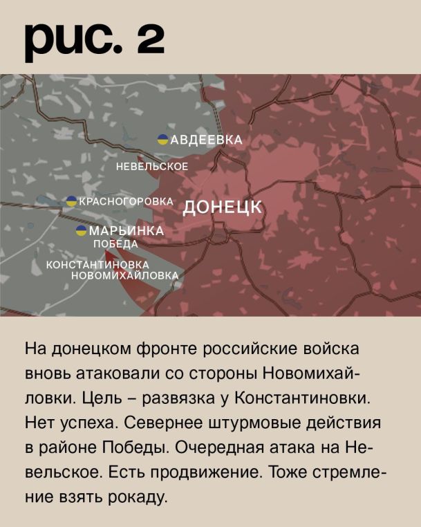 На донецком фронте российские войска вновь атаковали со стороны Новомихайловки. Цель – развязка у Константиновки. Нет успеха. Севернее штурмовые действия в районе Победы. Очередная атака на Невельское. Есть продвижение. Тоже стремление взять рокаду. (Рис. 2)