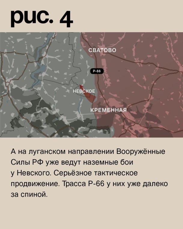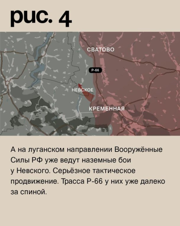 А на луганском направлении Вооружённые Силы РФ уже ведут наземные бои у Невского. Серьёзное тактическое продвижение. Трасса Р-66 у них уже далеко за спиной. (Рис. 4) Источник