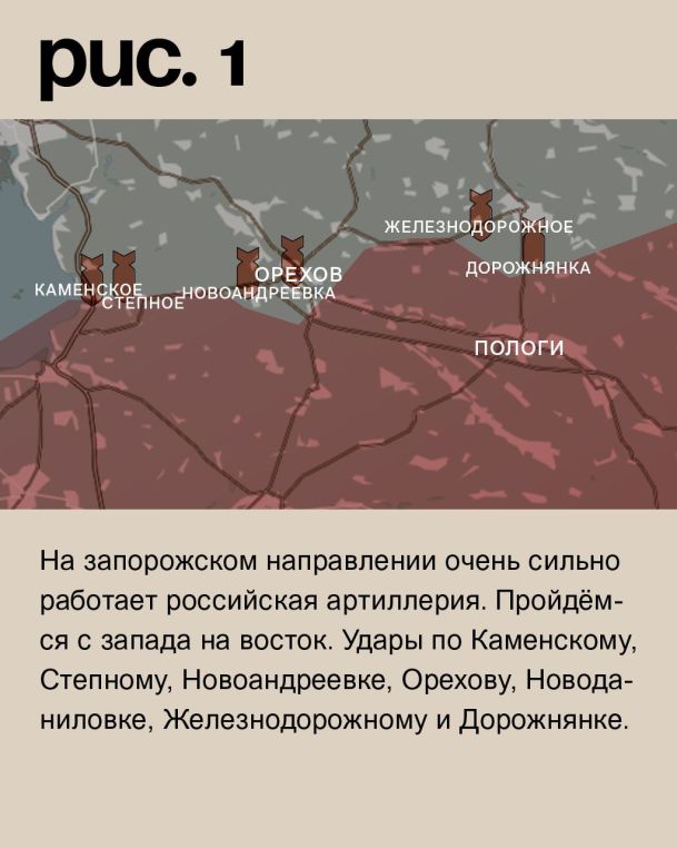 На запорожском направлении очень сильно работает российская артиллерия. Пройдёмся с запада на восток. Удары по Каменскому, Степному, Новоандреевке, Орехову, Новоданиловке, Железнодорожному и Дорожнянке. (Рис. 1)