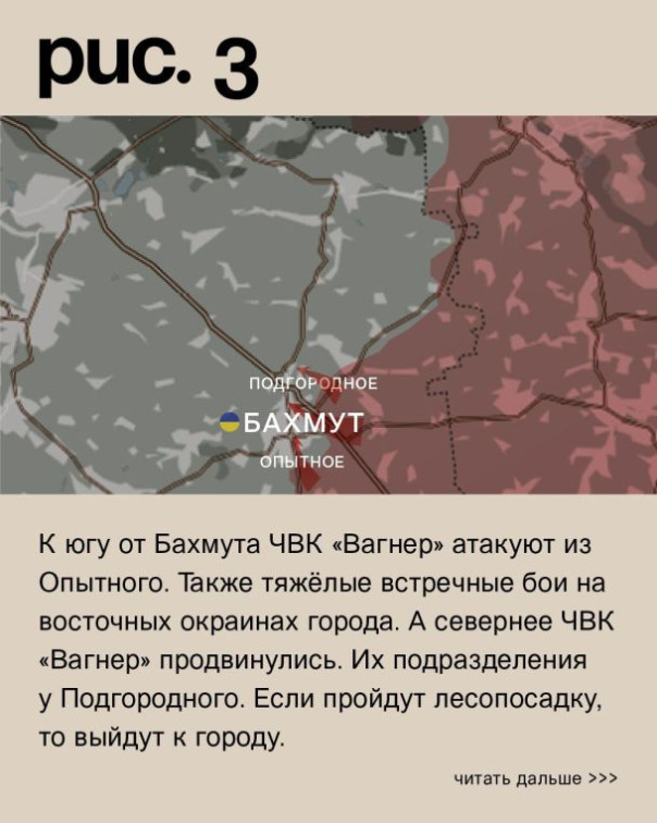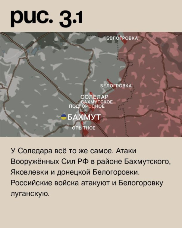 К югу от Бахмута ЧВК «Вагнер» атакуют из Опытного. Также тяжёлые встречные бои на восточных окраинах города. А севернее ЧВК «Вагнер» продвинулись. Их подразделения у Подгородного. Если пройдут лесопосадку, то выйдут к городу. У Соледара всё то же самое. Атаки Вооружённых Сил РФ в районе Бахмутского, Яковлевки и донецкой Белогоровки. Российские войска атакуют и Белогоровку луганскую. (Рис. 3)