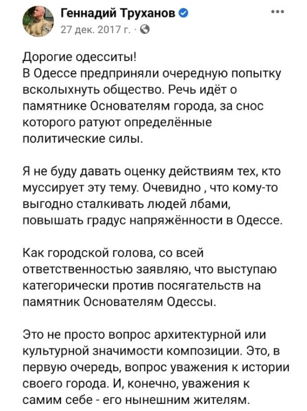 «В Одессе предприняли очередную попытку всколыхнуть общество. Речь идет о памятнике Основателям города, за снос которого ратуют определенные политические силы… Как городской голова, со всей ответственностью заявляю, что выступаю категорически против посягательств на памятник… Это, в первую очередь, вопрос уважения к истории своего города. И, конечно, уважения к самим себе — его нынешним жителям».
