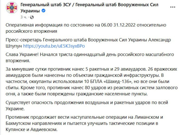 Также генштаб ВФУ подтверждает наступление ВС РФ на Лиманском направлении. К слову, если ранее в отношении Лимана украинский генштаб применял формулировку "ВС РФ пытаются улучшить свое тактическое положение", то в сегодняшней сводке пишут о полноценных наступательных действиях.