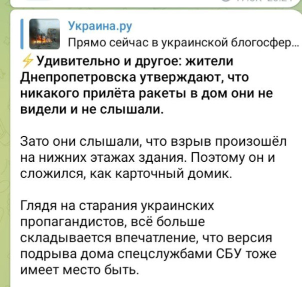 Абсолютное, недопустимое раньше безумие. Но что бы не случилось на Украине, даже если выяснится, что в этот дом вдруг по ошибке залетела наша российская ракета, я всё равно считаю что до этого безумия, крови и войны, до этой ситуации довели тупые украинские власти поддавшиеся националистическому угару. Все президенты этим занимались- каждый или по шагу, или сразу по десятку шагов, но приближал Украину к катастрофе. Даже, кажется на первый взгляд, относительно пророссийский Кучма и тот отметился книгой "Украина - не Россия". Украинские власти, да и сами украинцы, не понимали что Америка далеко за океаном, а Россия рядом? Здесь. Сильная, хоть и терпеливая до удивления. Но они с постоянным упрямством пинали Россию и радовались каждой разорванной связи с Россией даже в ущерб себе. Радовались каждому плевку в Россию, ждали когда заменят российский черноморский флот НАТОвским. Дни считали до этого. Россия предупреждала всех- НАТО на Украине это для России красная линия. Но на все наши заявления о красных линиях смеялись нам в лицо. Зная, что Россия рядом, они сознательно геноцидили русских у себя. А что творили с русским языком, с православной верой... Украина думала что это всё для неё пройдёт безнаказанно? "А что вы нам сделаете???"- ухмылялись они. Это умная политика???? Это умные политики??? Украинцы, вы блять, этого не видели??? Всё что вы сейчас претерпеваете это и на вашей общей совести.