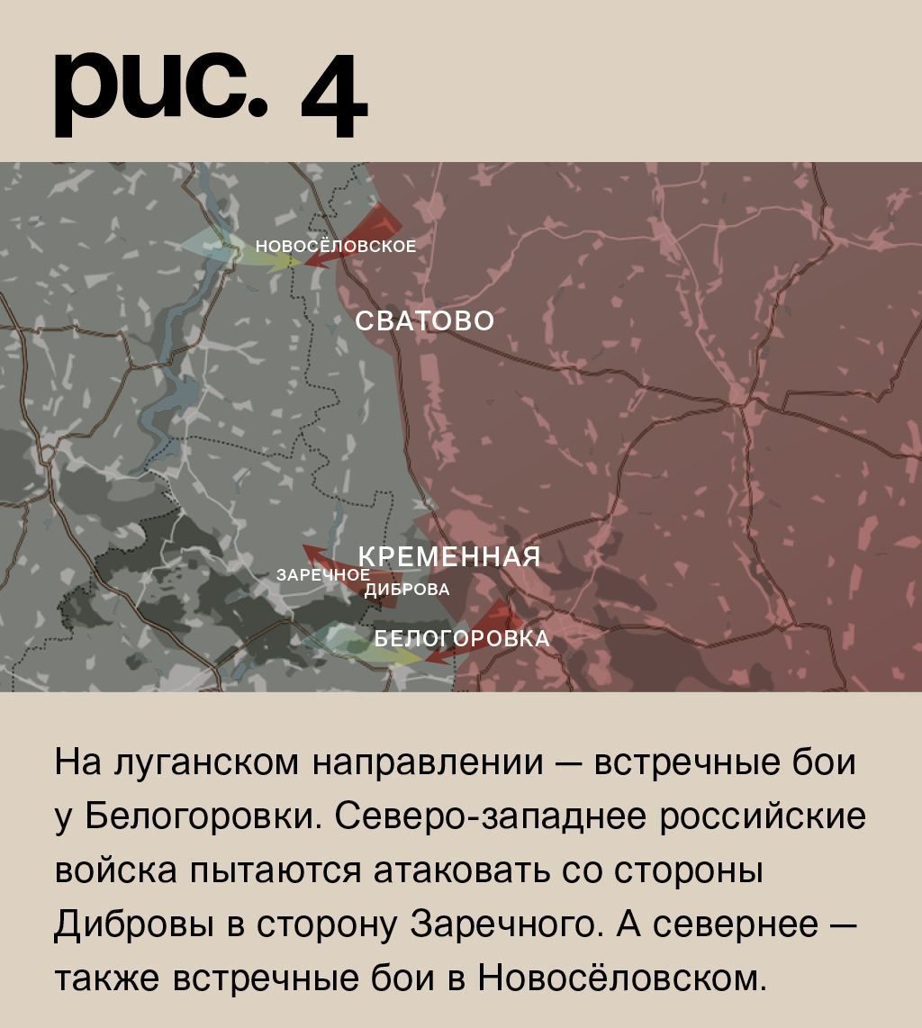 На луганском направлении – встречные бои у Белогоровки. Северо-западнее российские войска пытаются атаковать со стороны Дибровы в сторону Заречного. А севернее – также встречные бои в Новосёловском. (Рис. 4)