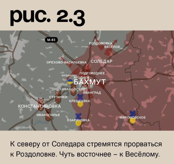 К юго-западу от Бахмута ВСУ обстреливают Озаряновку и Клещеевку. Ракетный удар по Мироновскому. Это глубокий тыл. Российская армия вела огонь по Иванополью, Константиновке, Ступочкам, Ивановскому и Бахмуту. Сам город взят в полукольцо. ЧВК «Вагнер» продвинулась на юге со стороны Иванграда. Также «оркестранты» установили контроль над новыми районами в восточной части Бахмута. На северо-востоке они продавили оборону ВСУ от Подгороднего, а с севера – от Ягодного. Но самое критическое положение украинских войск на северо-западе. Там ЧВК «Вагнер» сделала рывок к Богдановке. Таким образом, все линии снабжения ВСУ в Бахмуте под огневым контролем. «Оркестранты» также атакуют в направлении Орехово-Васильевки. К северу от Соледара стремятся прорваться к Роздоловке. Чуть восточнее – к Весёлому. (Рис. 2)
