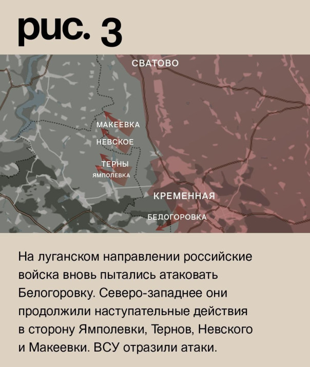 На луганском направлении российские войска вновь пытались атаковать Белогоровку. Северо-западнее они продолжили наступательные действия в сторону Ямполевки, Тернов, Невского и Макеевки. ВСУ отразили атаки. (Рис. 3)