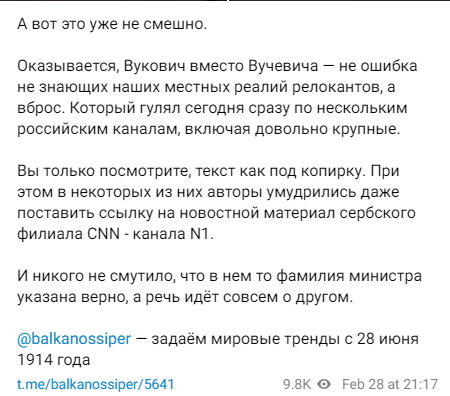 Однако в сети уже началась масштабная кампания против сербских властей. В погоне за сенсацией из всех телеграмных орудий распространяли информацию о том, что «министр обороны Вукович» якобы подтвердил поставки Украине, а сделала их Сербия под давлением ЕС. При этом ни одного из авторов не смутило, что никакого министра Вуковича в Сербии нет. Главу оборонного ведомства зовут Милош Вучевич, и подобных заявлений он не делал.